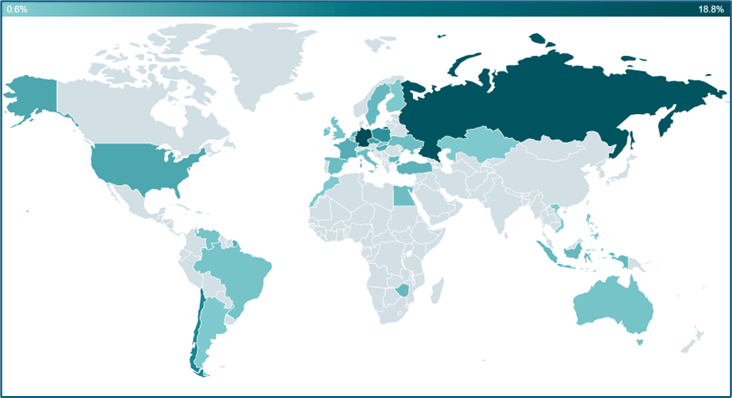 Obrázok 11. Geografická distribúcia malvéru a podvodov súvisiacich s NFC na systéme Android v prvom polroku 2025