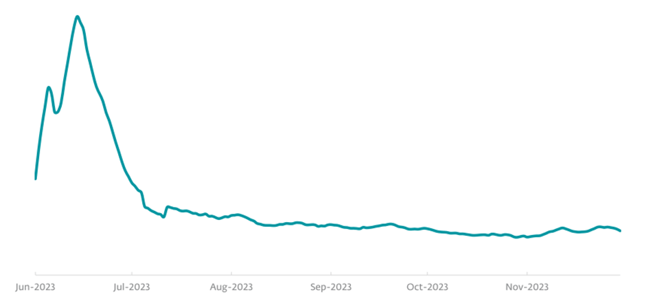Obrázok 5. Trend detekcie spyvéru SpinOk na Androide v druhom polroku 2023, sedemdňový kĺzavý priemer